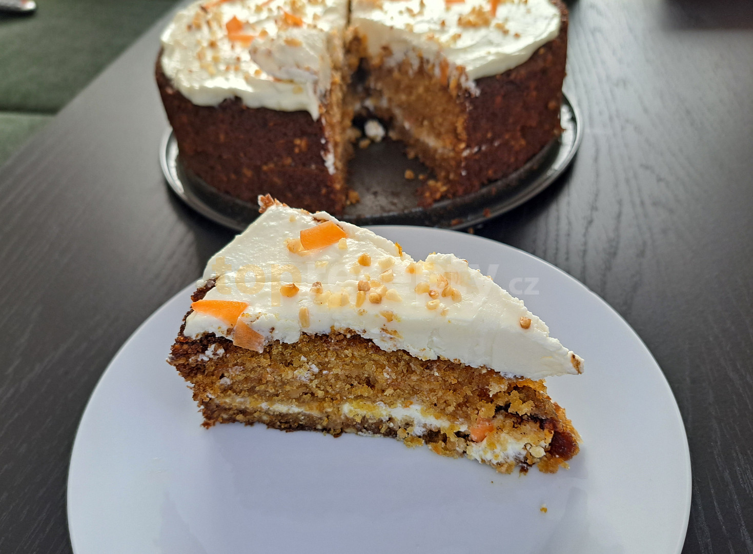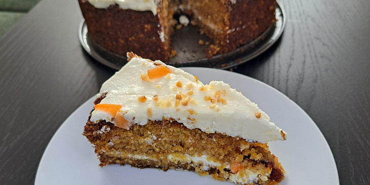 mouka polohrubá, vejce, cukr třtinový, mrkev, ořechy vlašské, cukr vanilkový, skořice mletá, olej, kypřící prášek do pečiva, soda jedlá, sůl, máslo, mouka polohrubá, sýr měkký tavený, cukr moučkový, šťáva citronová, máslo, ořechy vlašské