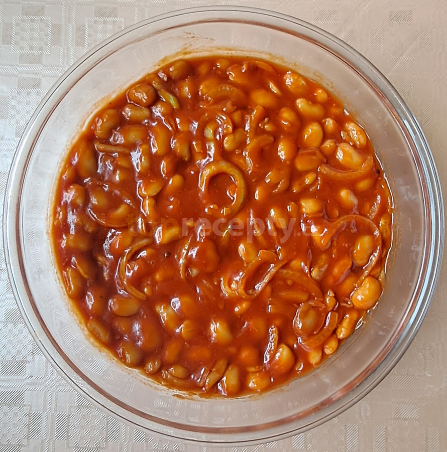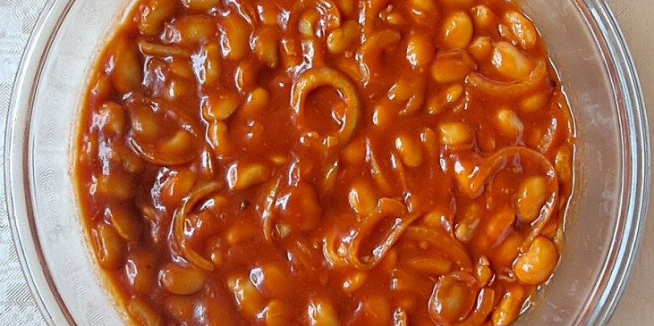 fazole bílé, česnek, cibule, máslo, protlak rajčatový, džus rajský, bobkový list, ocet, škrob, cukr krupice, sůl, pepř mletý, chilli