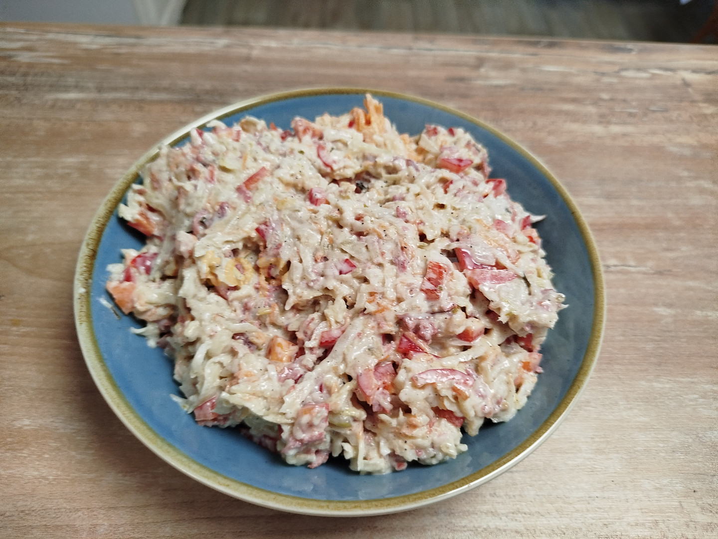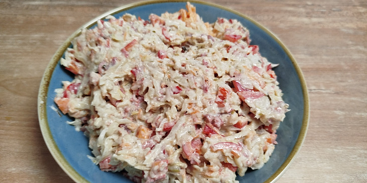 celer, mrkev, salám měkký, sůl, pepř mletý, hořčice plnotučná, okurky sterilované, paprika čerstvá červená, tatarská omáčka, lák z okurek