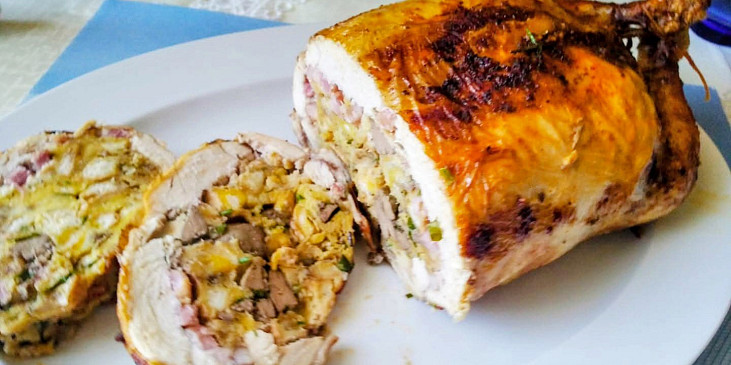 kuře, sůl, máslo, paprika sušená sladká, česnek, cibule, česnek, máslo, rohlík, ořech muškátový, vejce, slanina, máslo, petrželka, sůl, pepř mletý