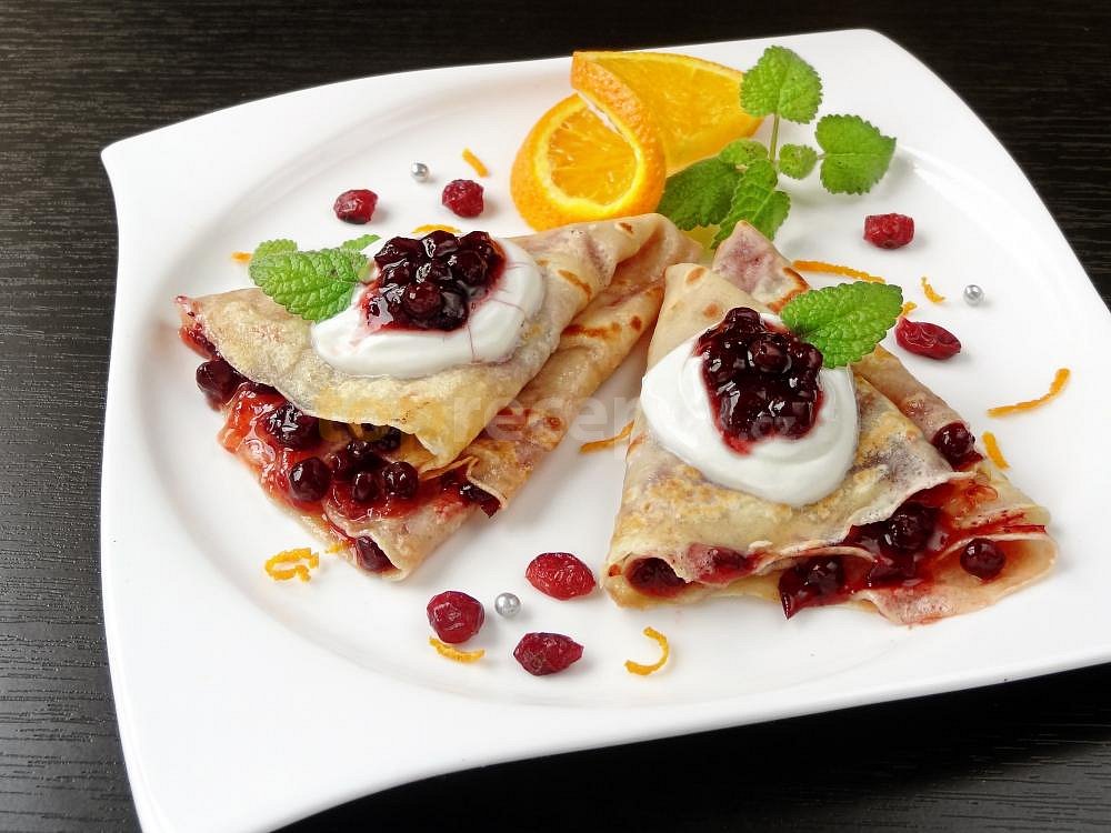 vejce, mléko, mouka polohrubá, cukr krupice, kypřící prášek do pečiva, sůl, skořice mletá, kůra pomerančová, smetana zakysaná, cukr moučkový, brusinky zavařené, meduňka, olej