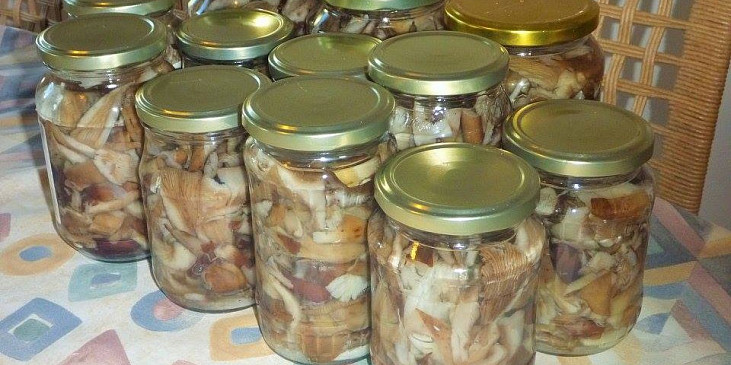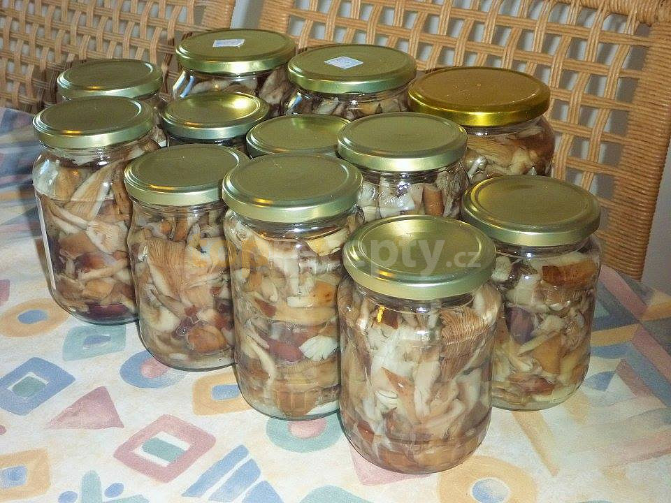 houby čerstvé, voda, ocet, sůl, cukr krupice, koriandr sušený, pepř celý, bobkový list, semínka hořčičná, křen, cibule