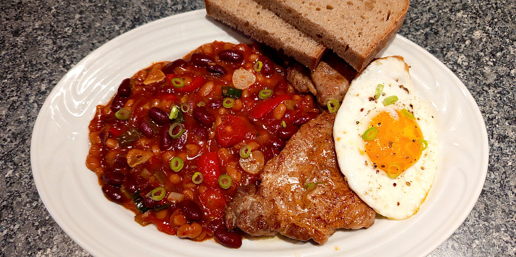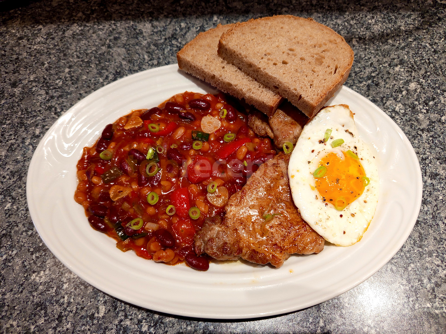 fazole bílé, fazole červené v nálevu, rajče cherry, cibule červená, paprika, česnek, pórek, protlak rajčatový, kečup sladký, omáčka chilli, omáčka sojová, cukr, chilli, voda, sůl, pepř mletý, olej, krkovice vepřová, vejce, sůl, pepř mletý, olej