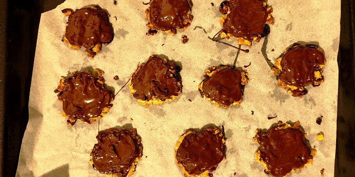 smetana ke šlehání, ořechy, kůra pomerančová kandovaná, ovoce kandované, cukr krupice, mouka hladká, máslo, med, poleva čokoládová, mandle sekané