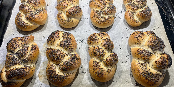 mouka hladká, droždí sušené, cukr krystal, sůl, sádlo, voda, mléko, sůl hrubá, kmín celý, mák