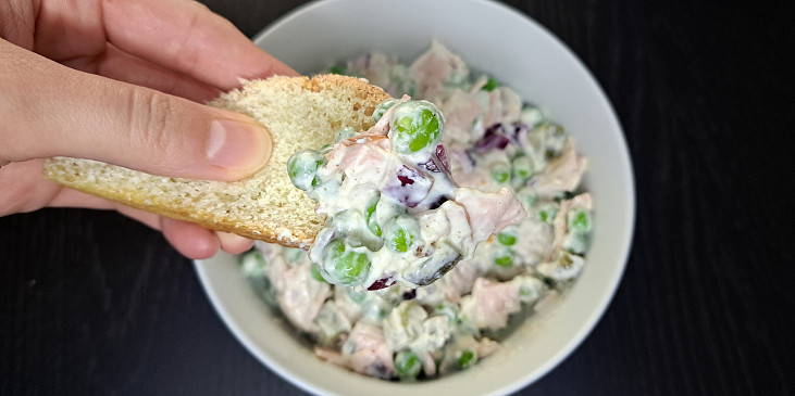 šunka, hrášek, okurky sterilované, cibule červená, tvaroh ve vaničce, sýr měkký tavený, hořčice, hořčice dijonská, pepř mletý, sůl