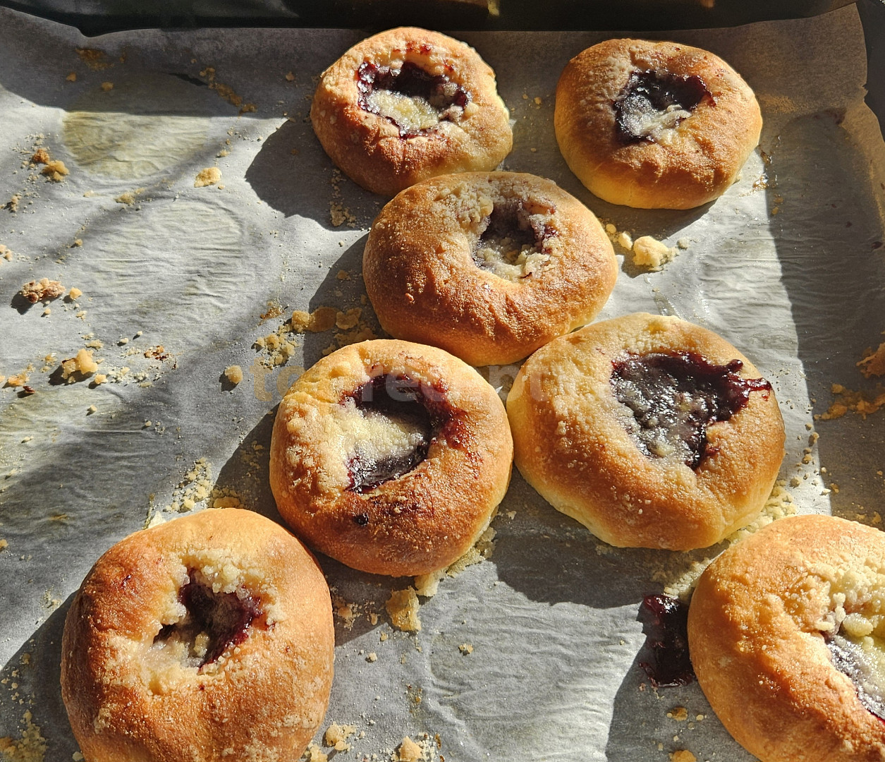 mouka hladká, droždí čerstvé, cukr krupice, mléko, olej, žloutek, sůl, kůra citronová, tvaroh, cukr moučkový, rozinky, vejce, povidla švestková, mouka hladká, cukr moučkový, máslo
