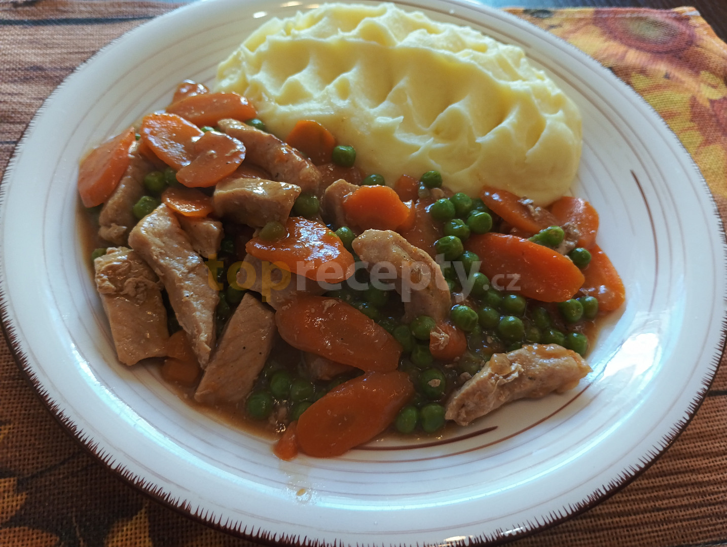 maso vepřové, hrášek, smetana zakysaná, hořčice plnotučná, mouka hladká, mrkev, cibule, koření gulášové, koření kari, koření nové koření, pažitka, petrželka, bazalka čerstvá, libeček, šťáva citronová