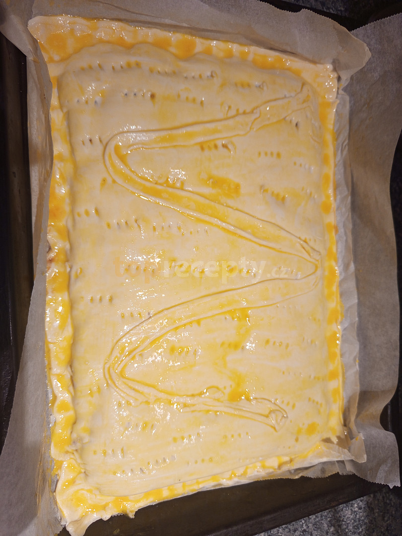 Přikryté druhým těstem a potřený vajíčkem s mlékem