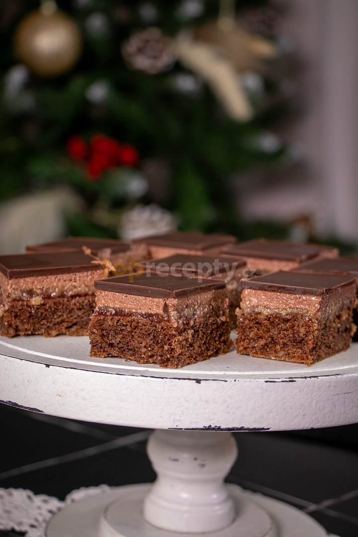 vejce, cukr moučkový, máslo, mouka hrubá, kakao, ořechy mleté, kypřící prášek do pečiva, ořechy vlašské, cukr moučkový, cukr vanilkový, rum, cukr krystal, máslo, vejce, kakao holandské, čokoláda na vaření, máslo, marmeláda rybízová, máslo, mouka hrubá