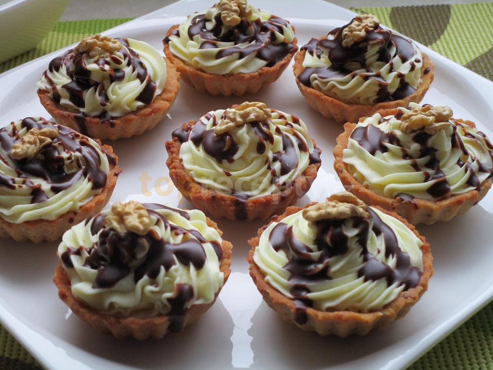 mouka polohrubá, cukr moučkový, žloutek, ořechy mleté, tuk hera, pudink vanilkový, cukr krupice, mléko, máslo, čokoláda, ořechy vlašské