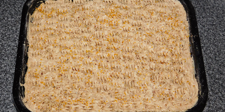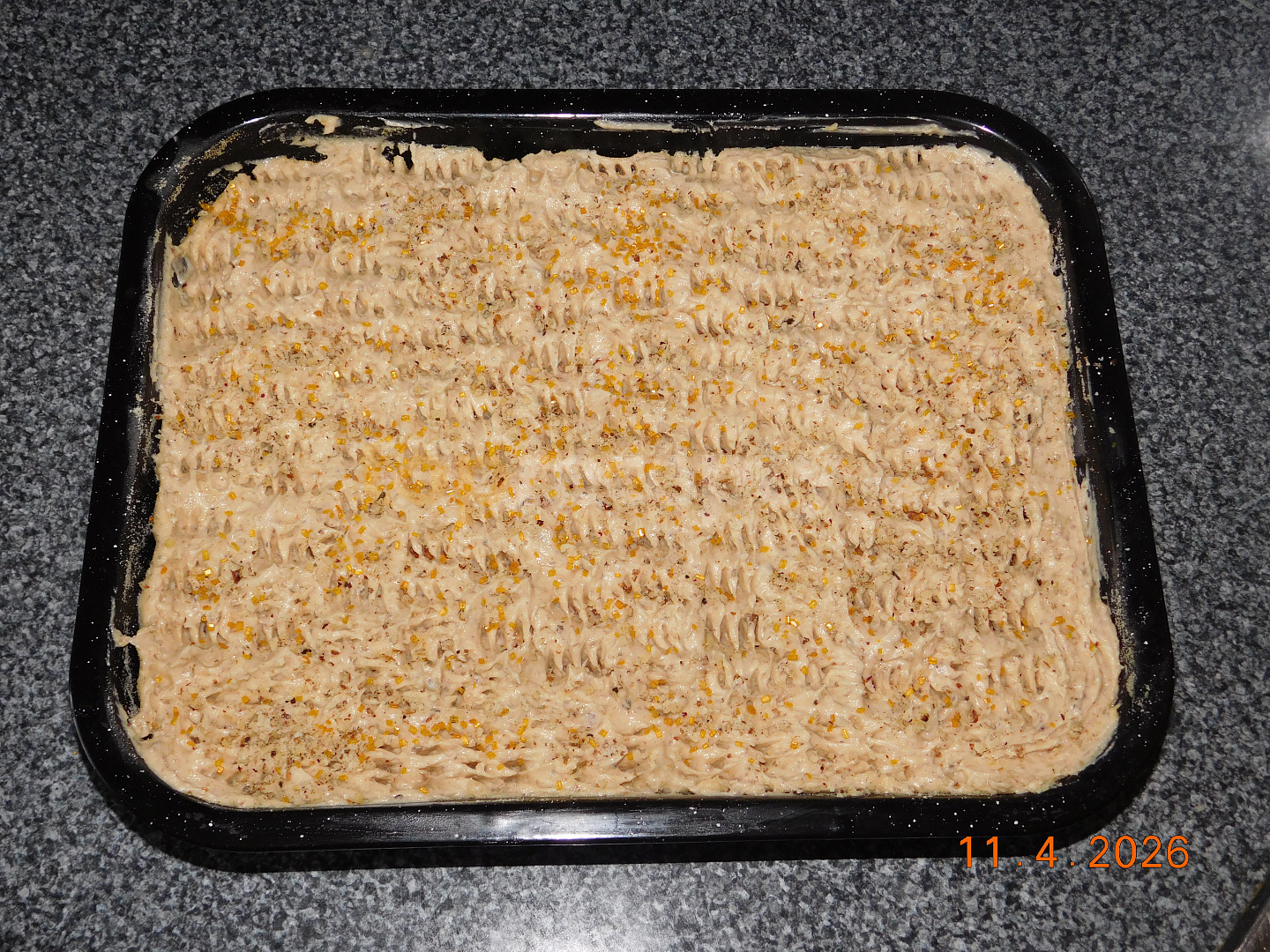 mouka hrubá, vejce, cukr moučkový, ořechy, poleva čokoládová, mléko, mouka hladká, cukr vanilkový, žloutek, ořechy mleté, máslo, cukr moučkový