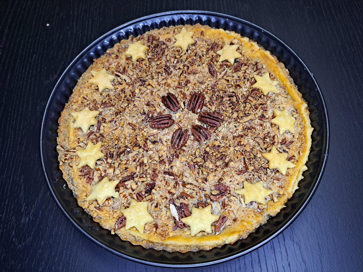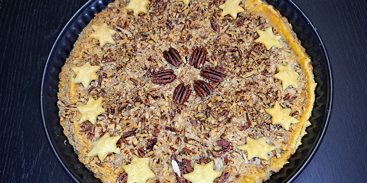 mouka hladká, tuk hera, šťáva citronová, voda, sůl, cukr krupice, voda, cukr třtinový, mouka polohrubá, vejce, máslo, cukr vanilkový, ořechy vlašské, ořechy pekanové, sirup javorový
