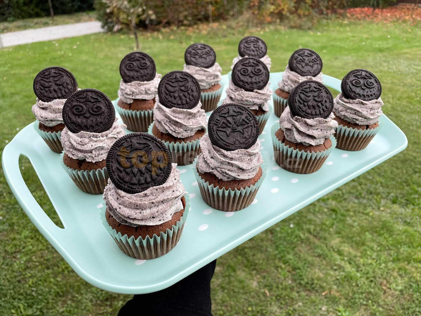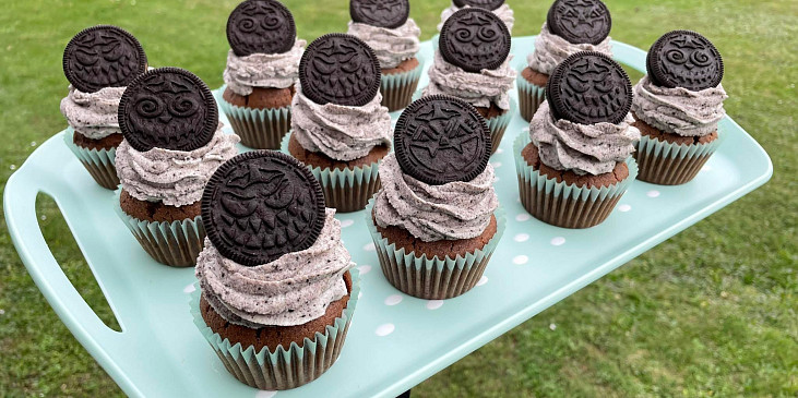vejce, cukr krupice, kakao, máslo, voda, mouka polohrubá, jogurt řecký, prášek do pečiva, soda jedlá, sůl, sušenky oreo, sýr philadelphia, smetana ke šlehání, cukr moučkový, sušenky oreo