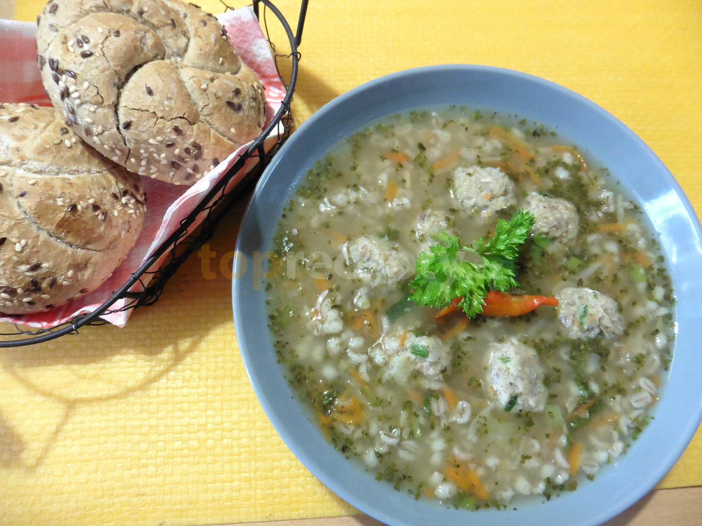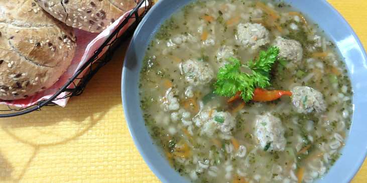 kost, mrkev, celer, petržel, cibule, koření nové koření, pepř černý, bobkový list, mrkev, celer, cibule, sádlo, kroupy, sůl, pepř mletý, majoránka sušená, česnek, sůl, maso vařené, vejce, rohlík, škrob, sůl, pepř mletý, koření do mletého masa, petrželka, strouhanka