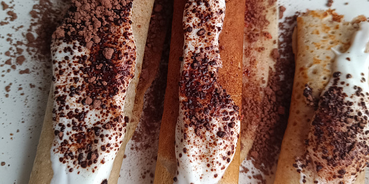 mléko, mouka hladká, cukr vanilkový, olej, rum, skořice, kůra citronová, sůl, máslo, marmeláda, pomazánka, cukr moučkový
