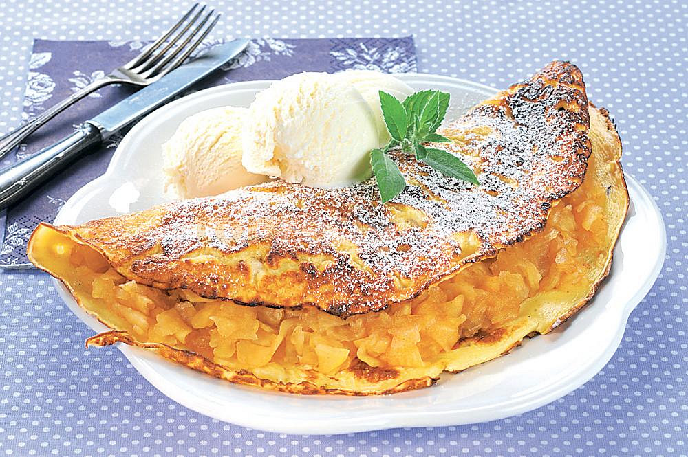 vejce, mouka hladká, cukr krystal, mléko, sůl, olej, jablko, voda, skořice mletá, cukr krystal, cukr moučkový, máta, zmrzlina vanilková
