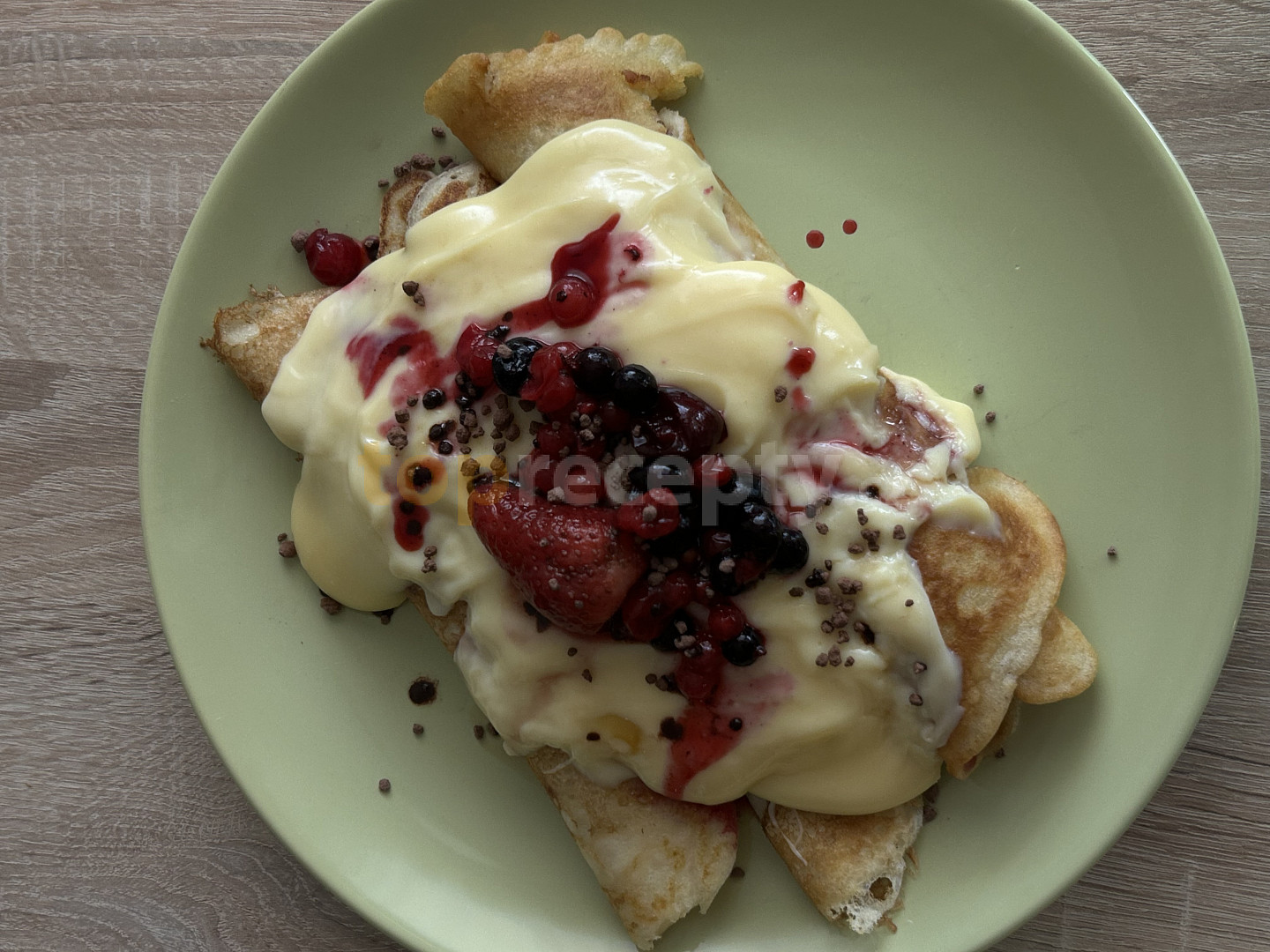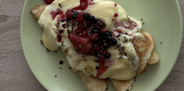 mléko, vejce, sůl, cukr, mouka hladká, prášek do pečiva, marmeláda pikantní, mléko, pudink vanilkový, cukr krystal, voda, ovoce, cukr, cukr vanilkový, solamyl