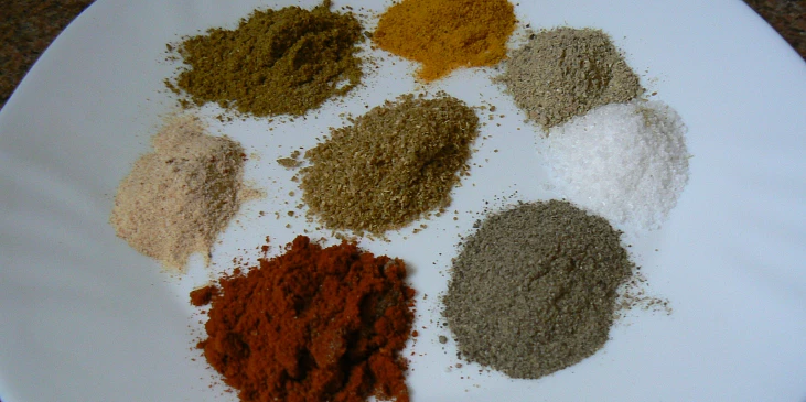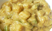 brambory, cibule, sůl, pepř černý, paprika čerstvá červená, česnek sušený, koření kari, kurkuma, koriandr sušený, kardamom, paprika čerstvá zelená, hořčice, majonéza, voda, olej