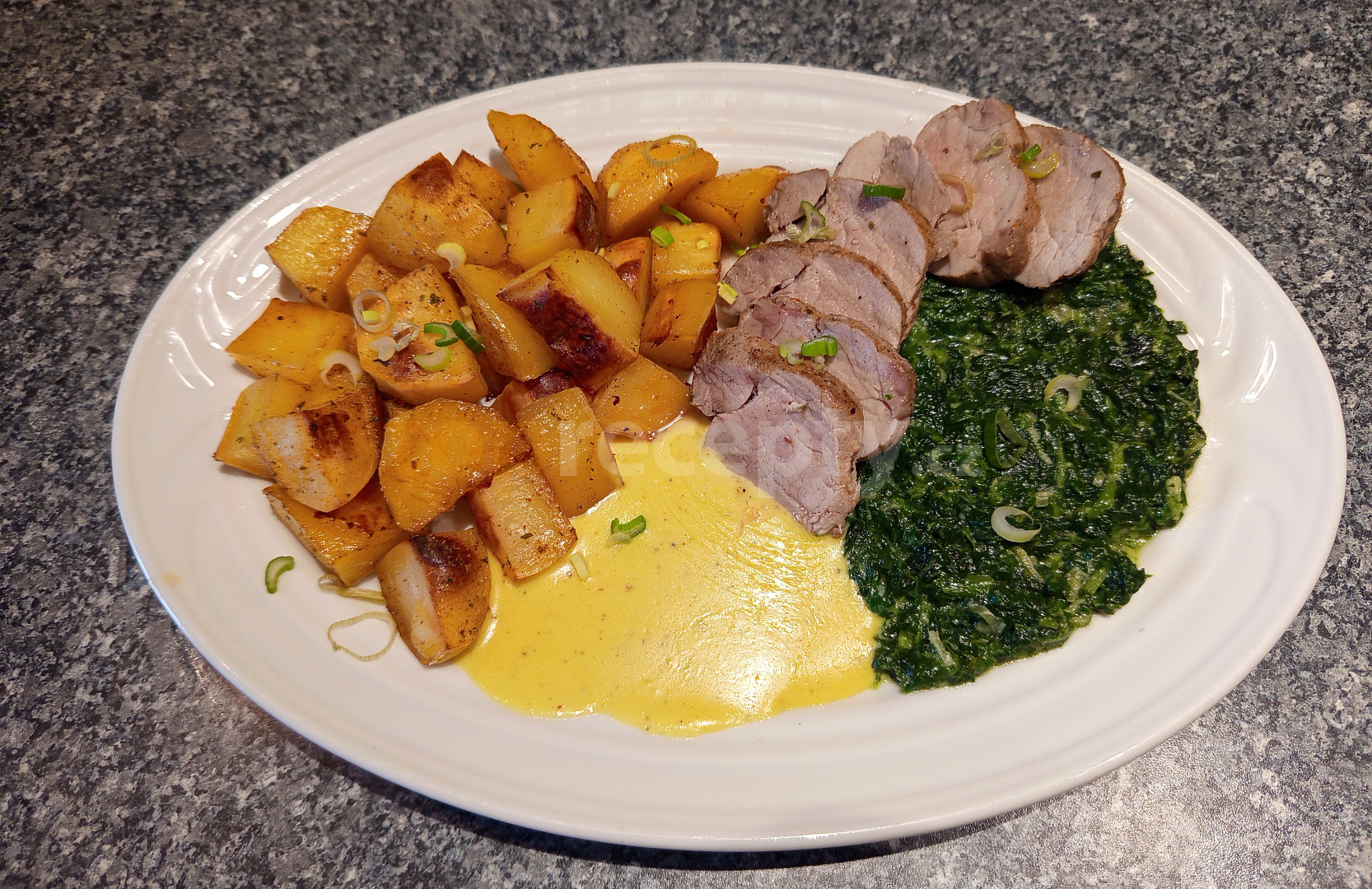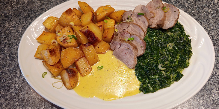 panenka vepřová, pepř mletý, sůl, olej, špenát listový mražený, česnek, cibule, smetana ke šlehání, pepř mletý, sůl, smetana ke šlehání, sýr chedar, sýr niva, pepř mletý, sůl