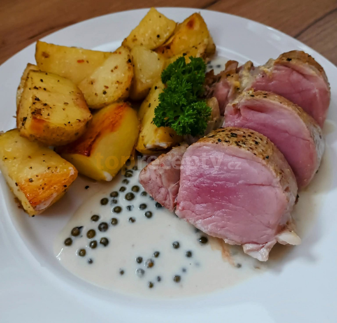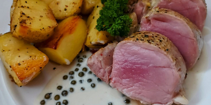 panenka vepřová, olej olivový, máslo, pepř zelený sterilovaný, kapary, hořčice, víno bílé, smetana ke šlehání, sůl, pepř mletý