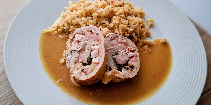 panenka vepřová, sůl, pepř mletý, špenát baby, bůček uzený, tymián, rozmarýn, cibule, česnek, špek, sádlo, mouka hladká, vývar masový, máslo, květák, cibule, česnek, sůl, pepř mletý, olej