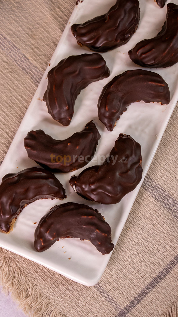 ořechy mleté, cukr moučkový, vejce, žloutek, mouka polohrubá, kakao, mléko, mouka polohrubá, máslo, cukr moučkový, cukr vanilkový, čokoláda na vaření, máslo