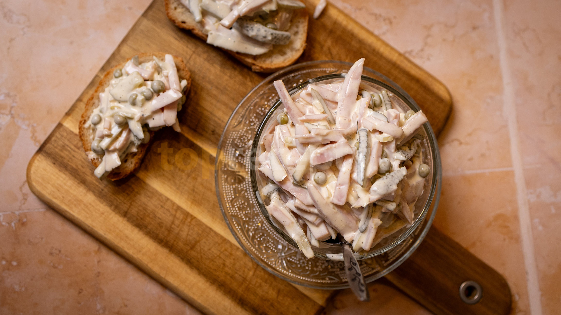 salám, okurky sterilované, majonéza, hrášek, cibule, hořčice, ocet, cukr krupice, omáčka worcesterová, pepř mletý, sůl