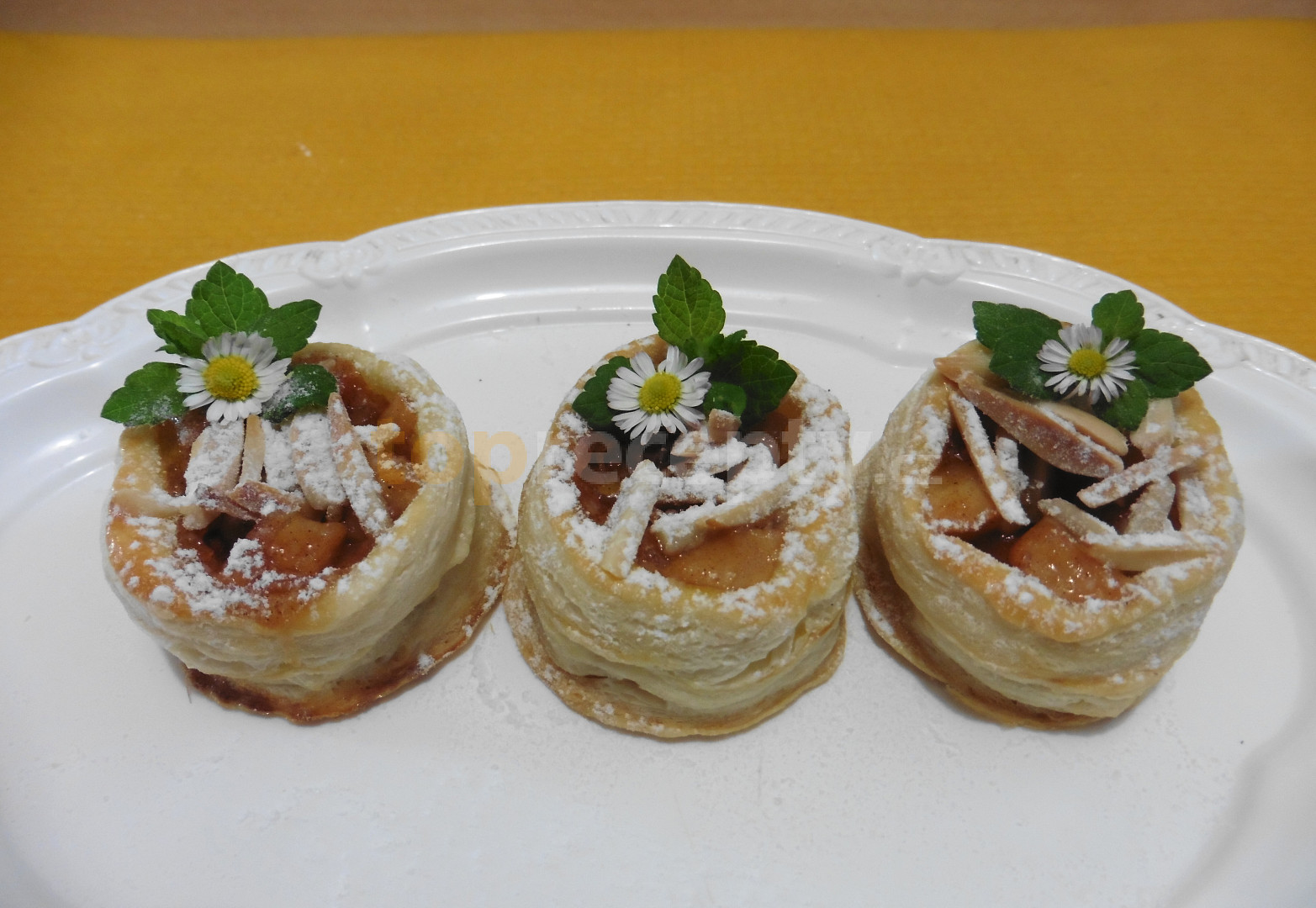 těsto listové, jablko, cukr krystal, voda, kyselina citronová, skořice, pudink vanilkový, hranolky, vejce, cukr moučkový, meduňka