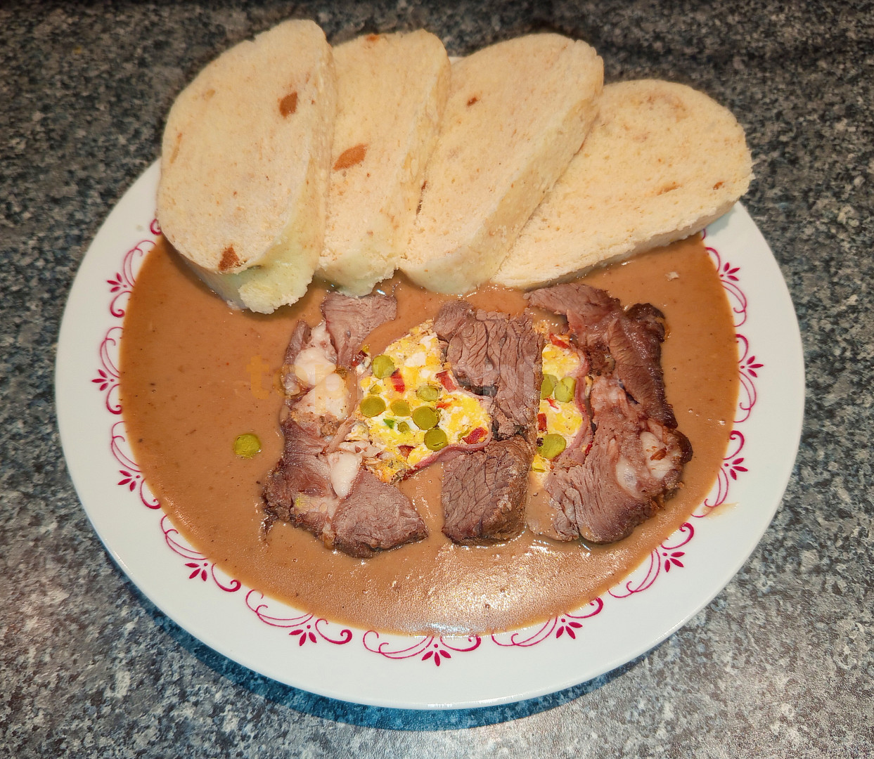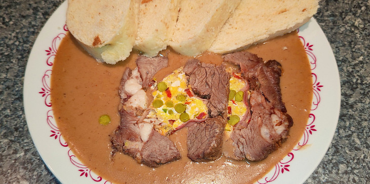 krk hovězí, vejce, hrášek sterilovaný, paprika čerstvá červená, hořčice, cibule, česnek, slanina, smetana na vaření, mouka hladká, olej, sůl, pepř mletý