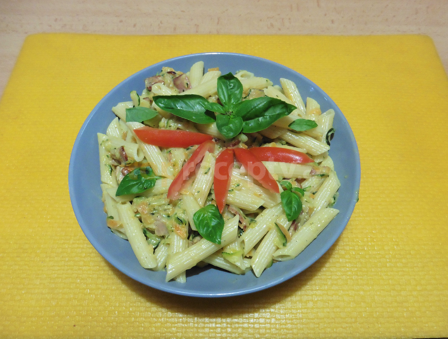 těstoviny penne, cibule, mrkev, olej olivový, cuketa, slanina, smetana na vaření, sýr gran moravia, sůl, pepř mletý, bazalka čerstvá