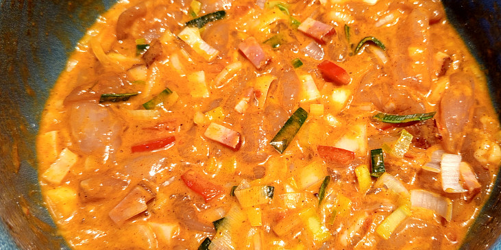 prsa kuřecí, slanina, cibule, pórek, paprika, česnek, hořčice dijonská, olej, vejce, paprika sušená pálivá, koření na kuřecí maso, pepř mletý, omáčka sojová, pivo černé, mouka hladká, solamyl, strouhanka, sůl, olej