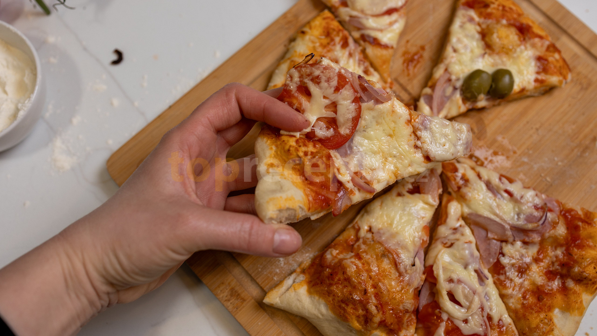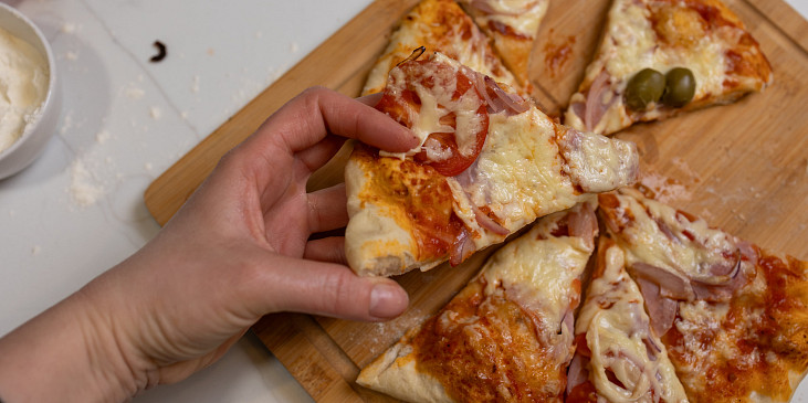 droždí sušené, voda, mouka polohrubá, olej rostlinný, sůl, mouka polohrubá, sugo, česnek, olej olivový, salám, rajče, cibulka jarní, cibule, sýr, bazalka čerstvá