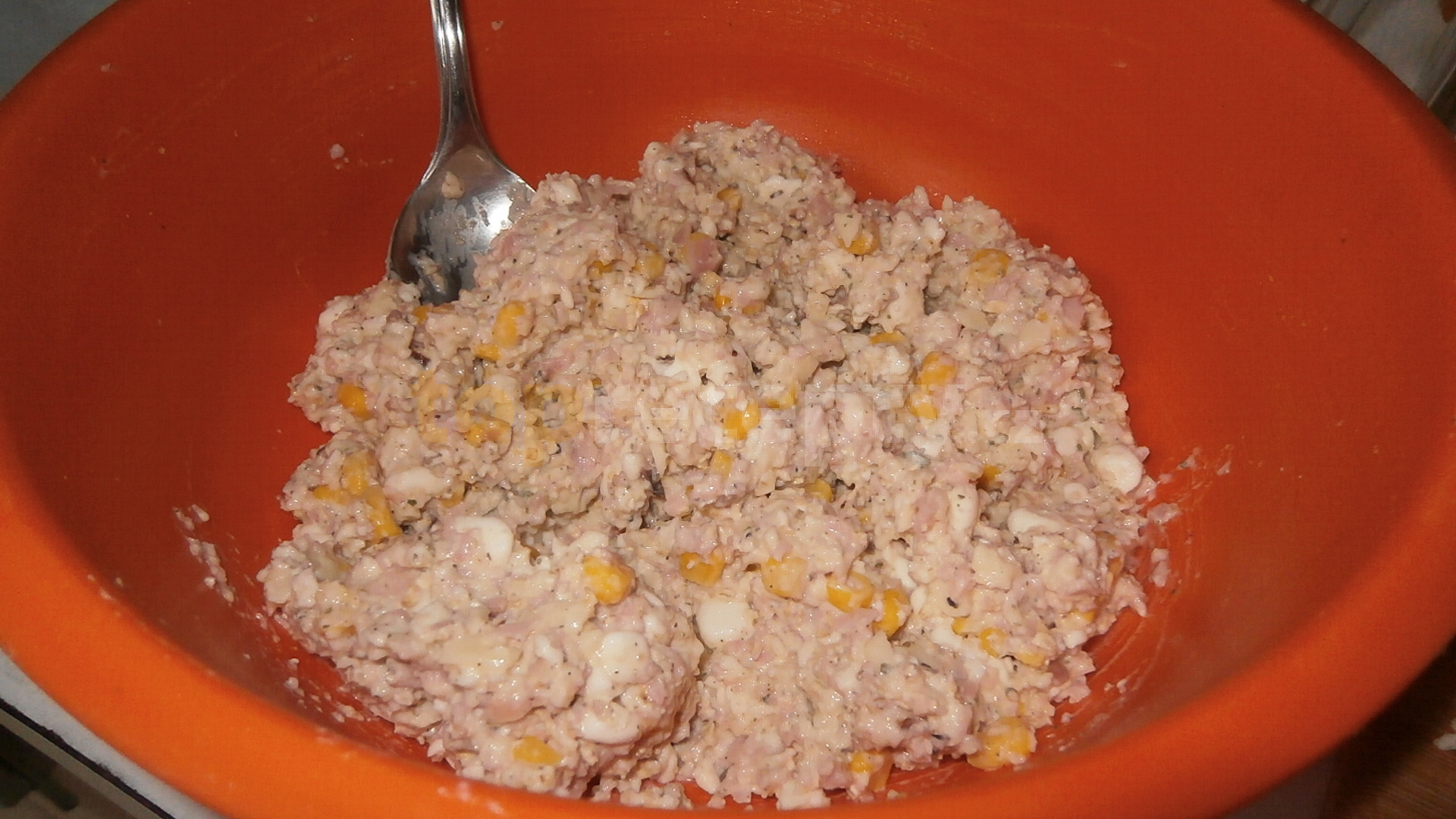 sýr cottage, šunka, sýr, vejce, kukuřice sterilovaná, bylinky, pepř mletý, sůl, česnek sušený, vločky ovesné, sýr mozzarella