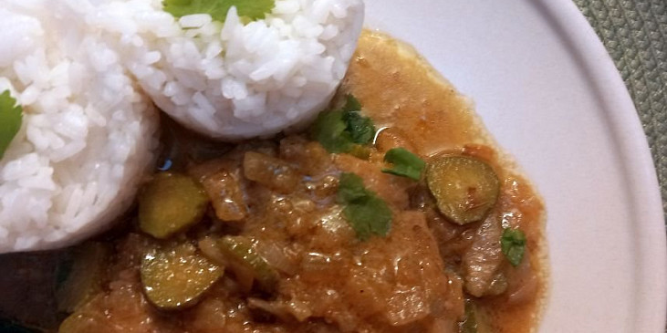 krkovice vepřová, cibule, okurky sterilované, koriandr, mouka hladká, sádlo, hořčice plnotučná, lák z okurek, vývar masový, sůl, pepř mletý, koriandr čerstvý