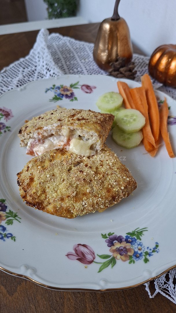 prsa kuřecí, paprika sušená sladká, kurkuma, kmín drcený, sůl, pepř mletý, sýr smetanový, rajče, sýr tvrdý, olej, vejce, strouhanka