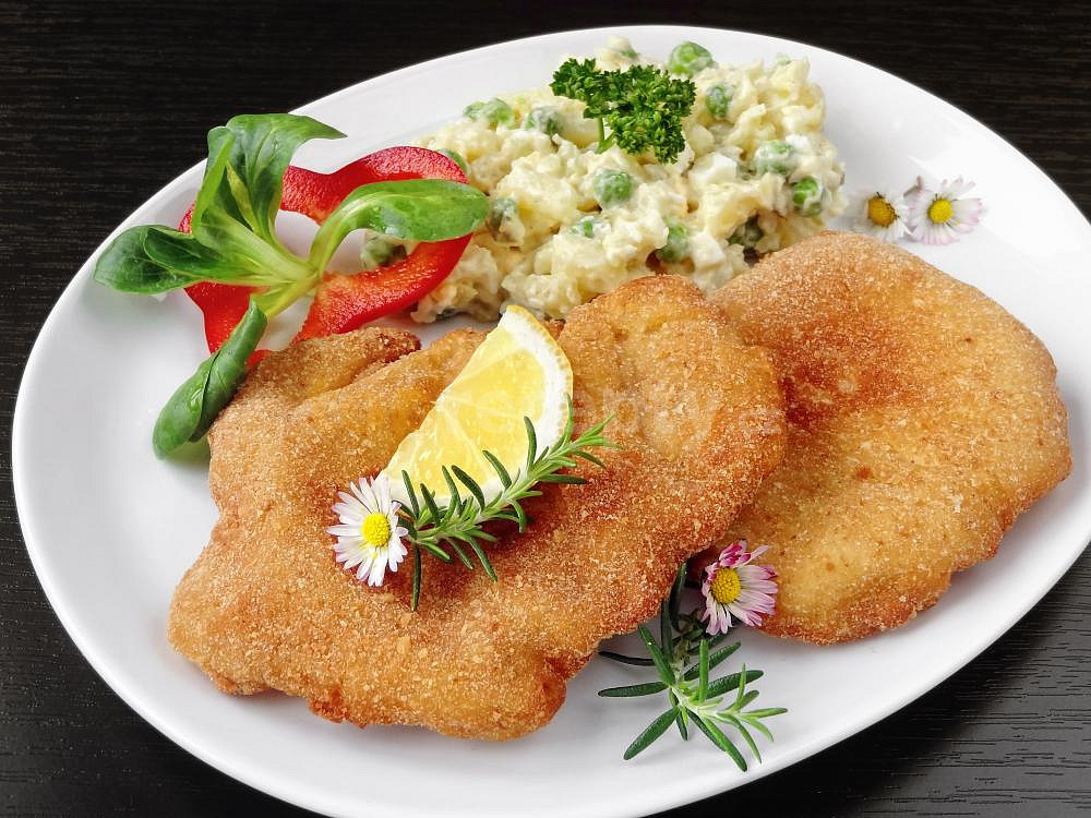 kýta dančí, šunka, sýr ementál, vejce, mouka hladká, strouhanka, mléko, sůl, pepř mletý, podravka, olej, rozmarýn, citron