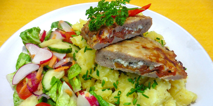 maso vepřové, škrob, lučina, sýr niva, rajče, vejce, parmazán, sůl, pepř mletý, česnek sušený, petrželka, chilli paprika čerstvá