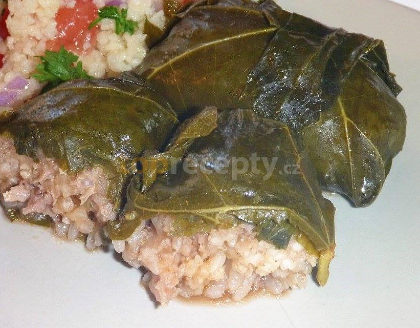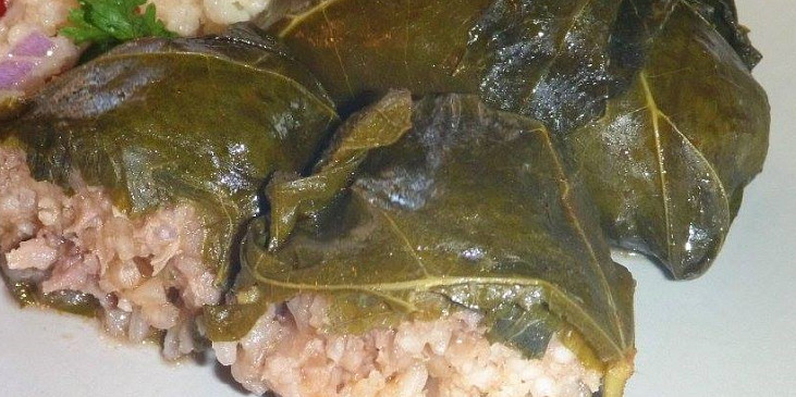 maso mleté, rýže, cibule, olej, česnek, sůl, nať petrželová, pepř černý, krém feferonkový, listy vinné, šťáva rajčatová, vývar masový, sůl, pepř černý, koření nové koření, bobkový list, skořice, krém feferonkový