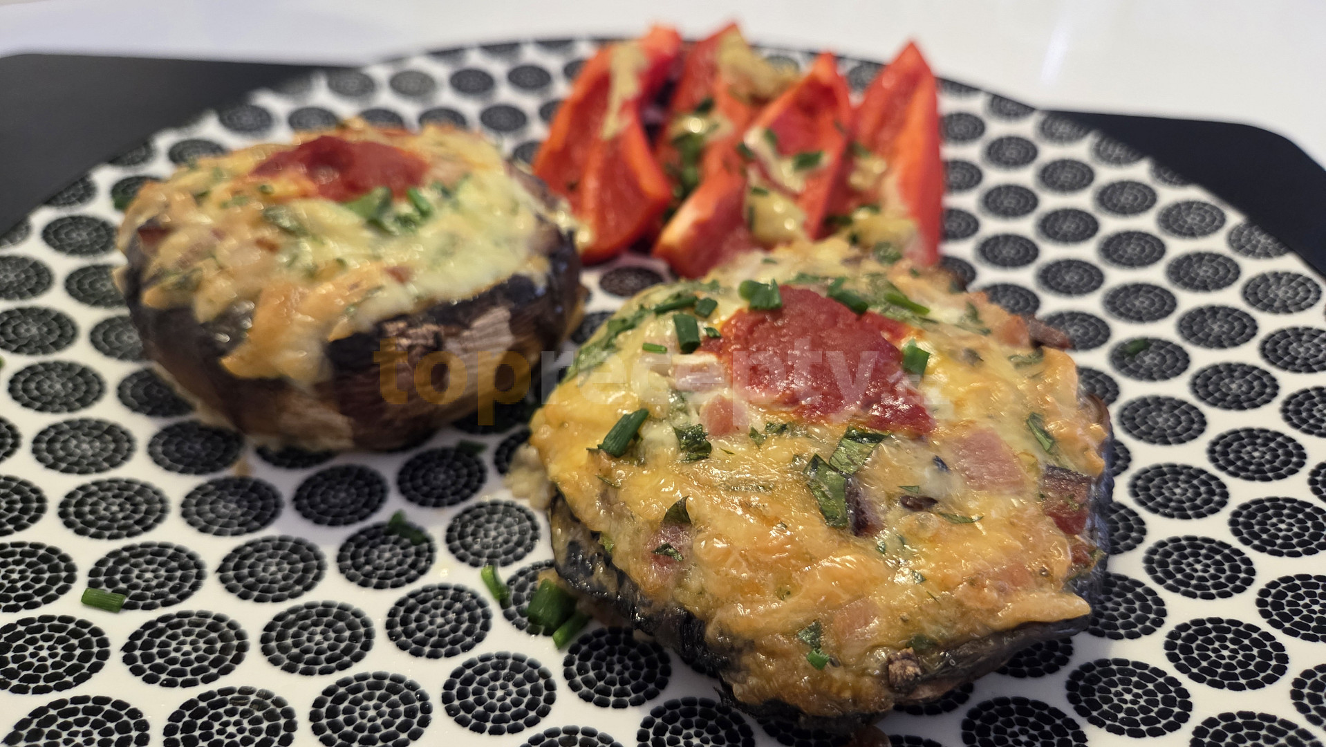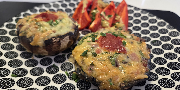 portobello, klobása pikantní, sýr gouda, špenát baby, strouhanka, máslo