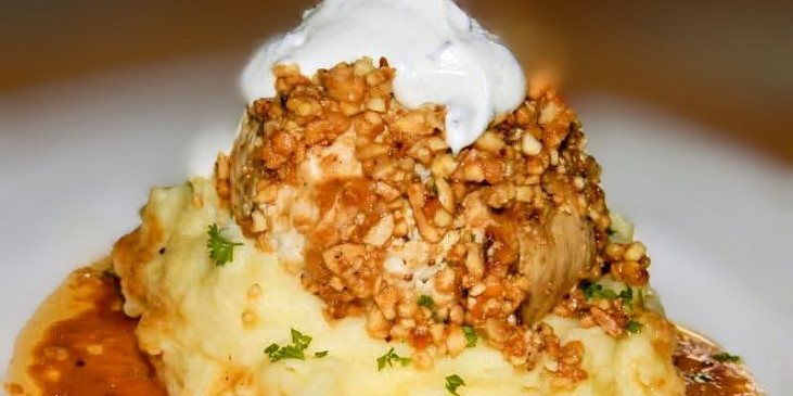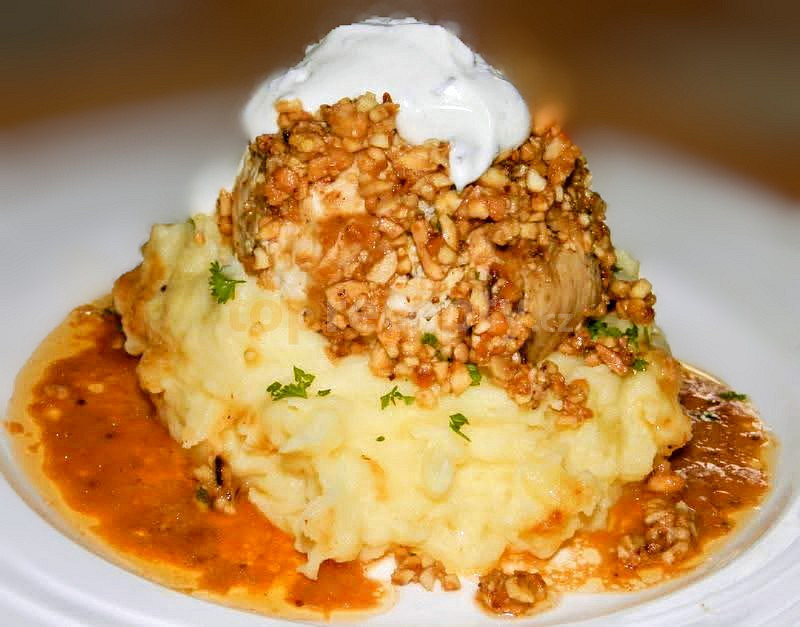 prsa kuřecí, sůl, pepř mletý, slanina farmářská, sýr niva, paprika čerstvá červená, mandle drcené, ghee, brambory, sůl, máslo, smetana na vaření, smetana kysaná