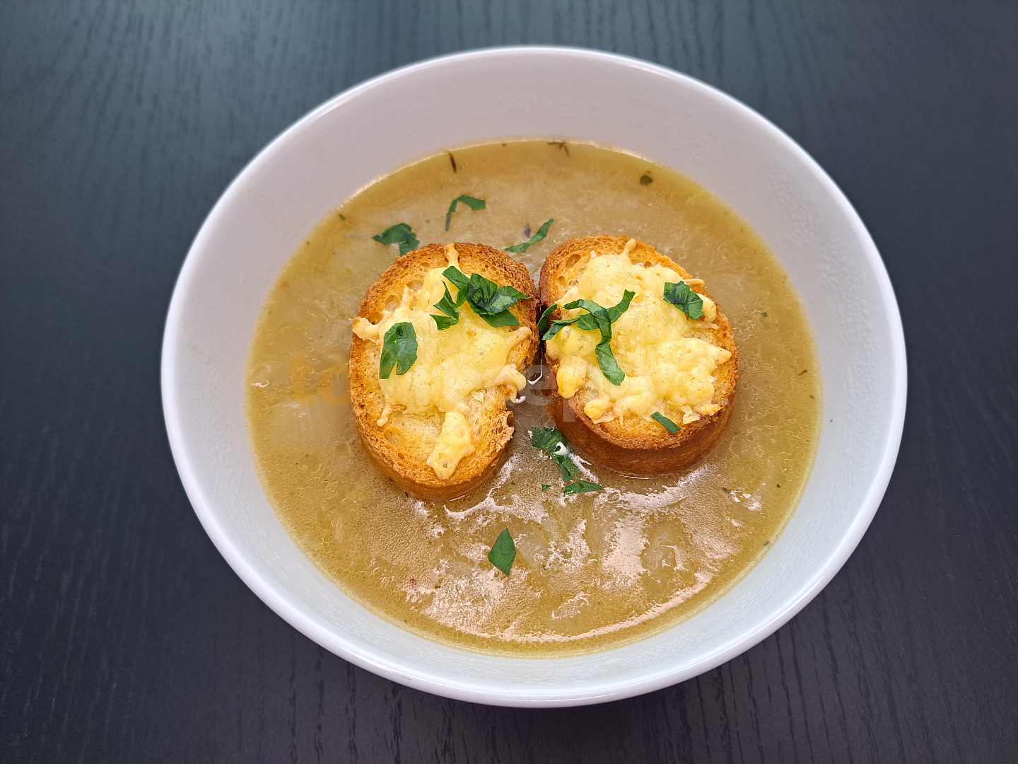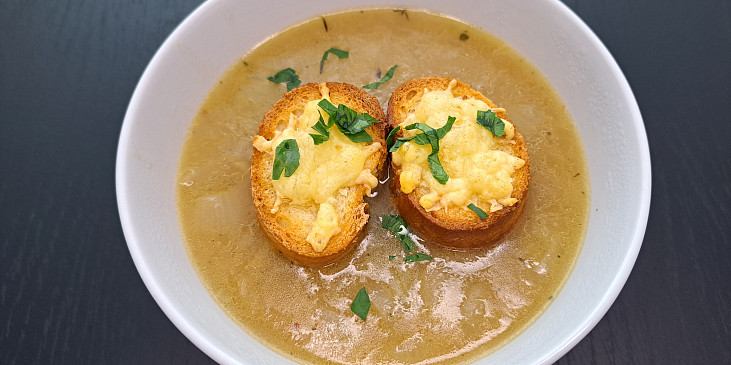 cibule, máslo, olej, česnek, víno bílé, mouka hladká, vývar masový, omáčka worcesterová, tymián čerstvý, sůl, pepř mletý, bageta, sýr strouhaný, čerstvé bylinky