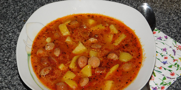 párky frankfurtské, brambory, sádlo, cibule, paprika sušená sladká, mouka hladká, pepř mletý, voda, česnek, sůl, koření polévkové, nať petrželová