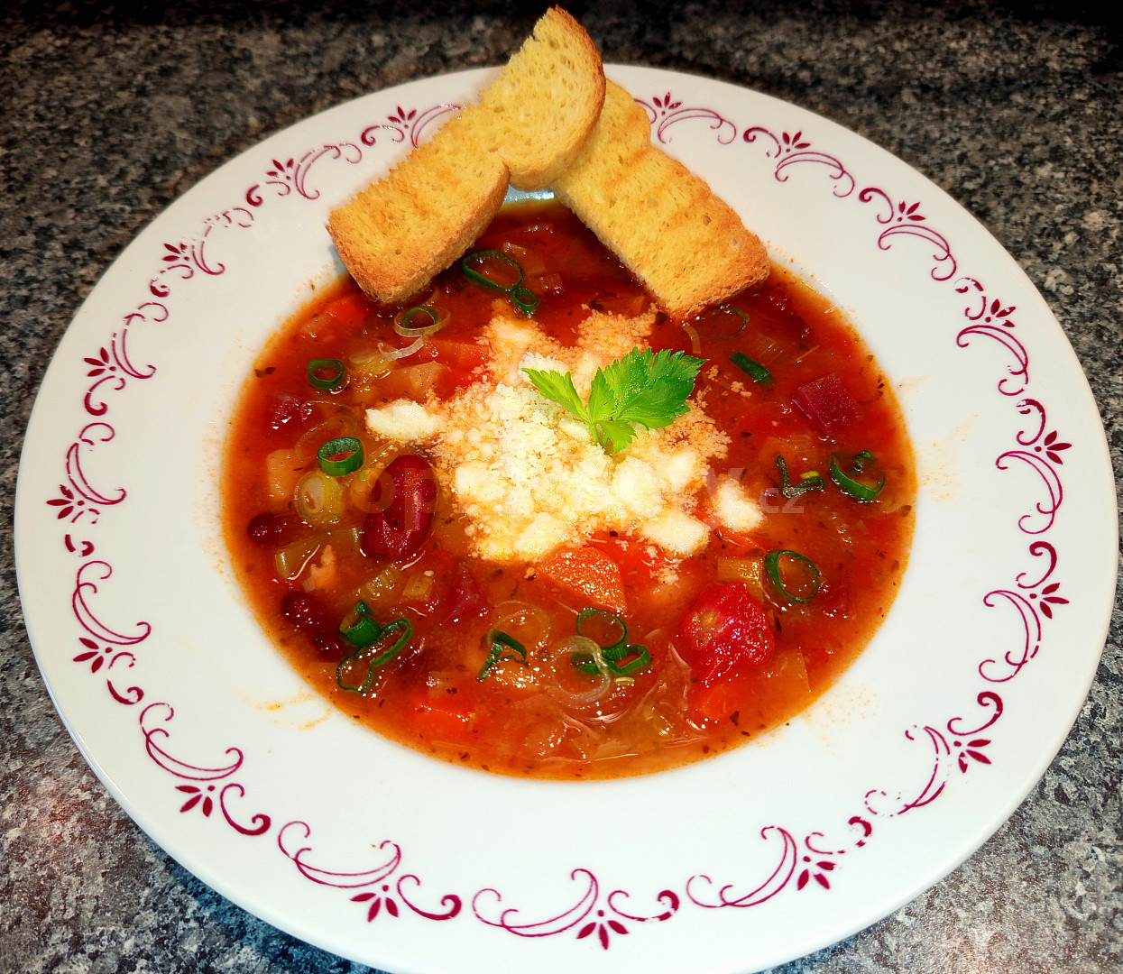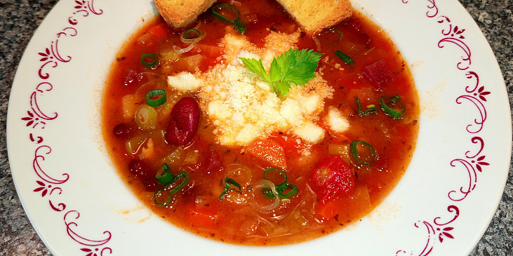 fazole červené, voda, cibule červená, česnek, slanina, rajče, protlak rajčatový, mrkev, petržel, cuketa, celer, pórek, řepa červená, brambory, tymián, rozmarýn, koření oregáno, cukr krystal, omáčka sojová, krupice, olej, sůl, pepř mletý, sýr mozzarella, krutony, cibulka jarní