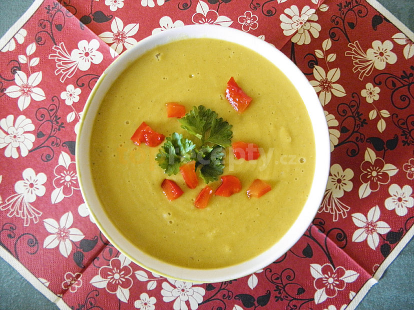 cibule, paprika čerstvá zelená, zázvor, čočka červená, vývar masový, koření kari, paprika sušená sladká, česnek, sůl, pepř mletý, chilli, olej
