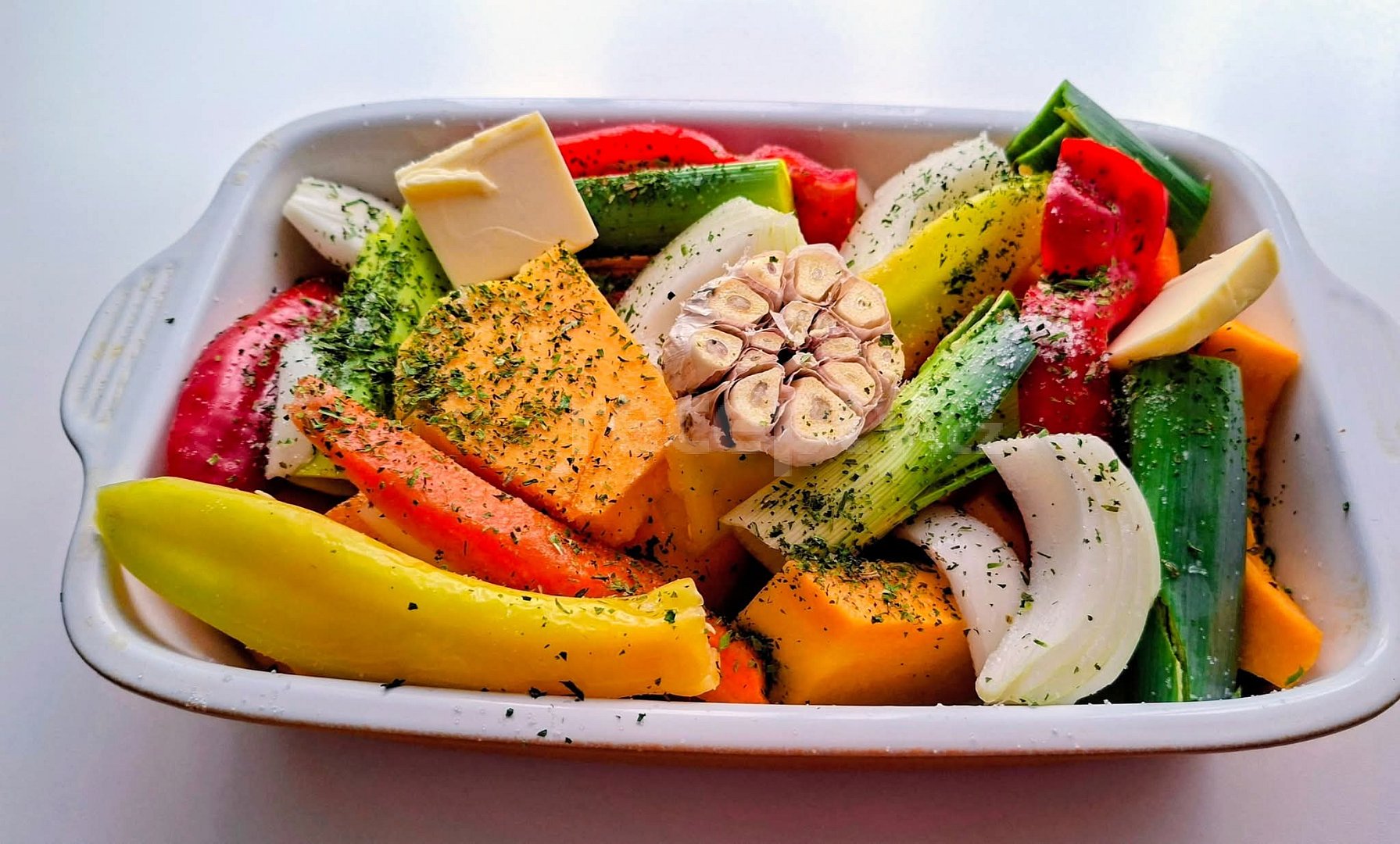 dýně muškátová, cibule, paprika, pórek, česnek, mrkev, sůl, pepř mletý, bylinky polévkové, máslo, smetana ke šlehání, vývar zeleninový