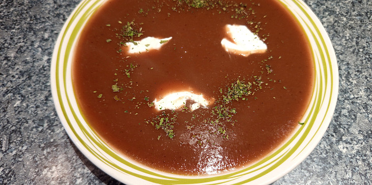 řepa červená, mrkev, celer, cibule, olej olivový, vývar kuřecí, sůl, pepř, tymián, ocet balsamiko, smetana zakysaná, česnek