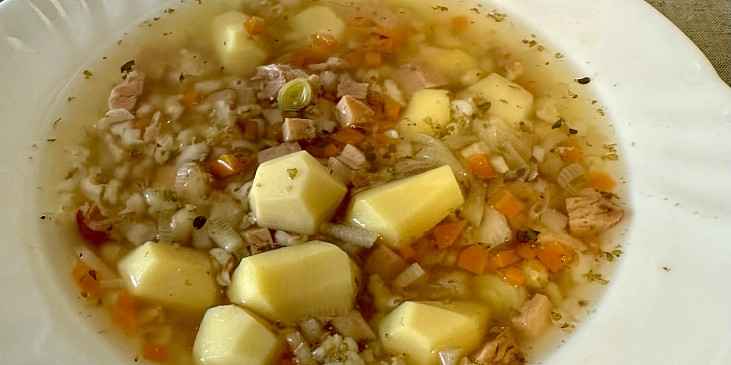 maso uzené, zelenina kořenová, kroupy ječné, brambory, pepř mletý, sůl, česnek, majoránka