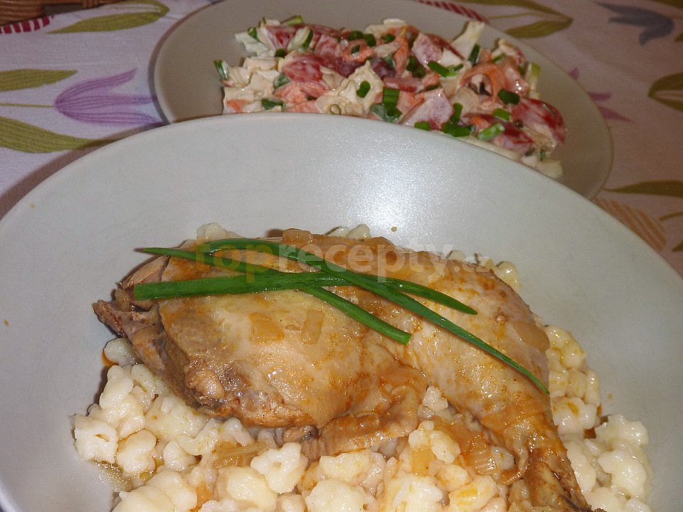 stehno kuřecí, bobkový list, koření nové koření, koření grilovací, pepř mletý, paprika sušená sladká, kmín mletý, maggi, cibule, olej, jíška tmavá hotová, rýže, kompot ovocný