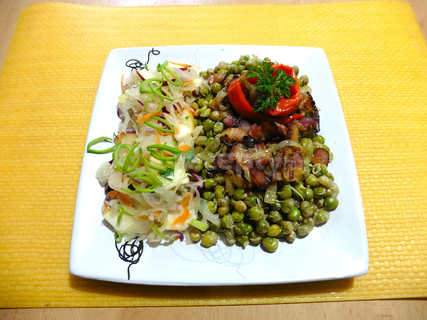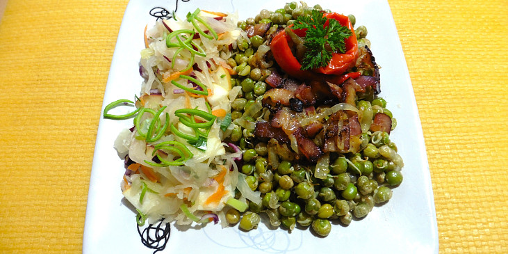 hrách, slanina anglická, cibule, sádlo, sůl, pepř mletý, zelí kysané, jablko, jablko, mrkev, cibule červená, cibulka jarní, olej olivový, sůl, pepř mletý, cukr krupice